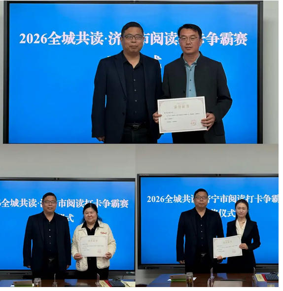 会前举行了2026“全城共读·济宁市阅读打卡争霸赛”颁奖仪式,该活动自启动以来,吸引了全市广大读者的热情参与,营造了浓厚的全民阅读氛围。根据活动期间的参与率、打卡完成度及阅读成效等综合评定,兖州区、任城区、邹城市分获金、银、铜奖。与会领导现场为获奖单位颁发奖牌,并鼓励各单位持续推动全民阅读向纵深发展。