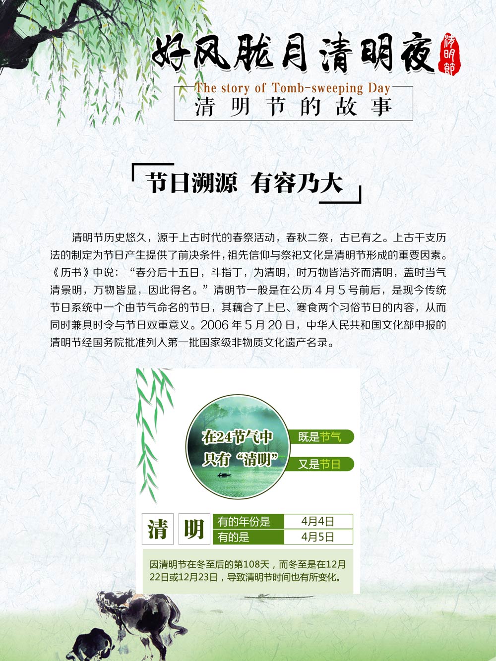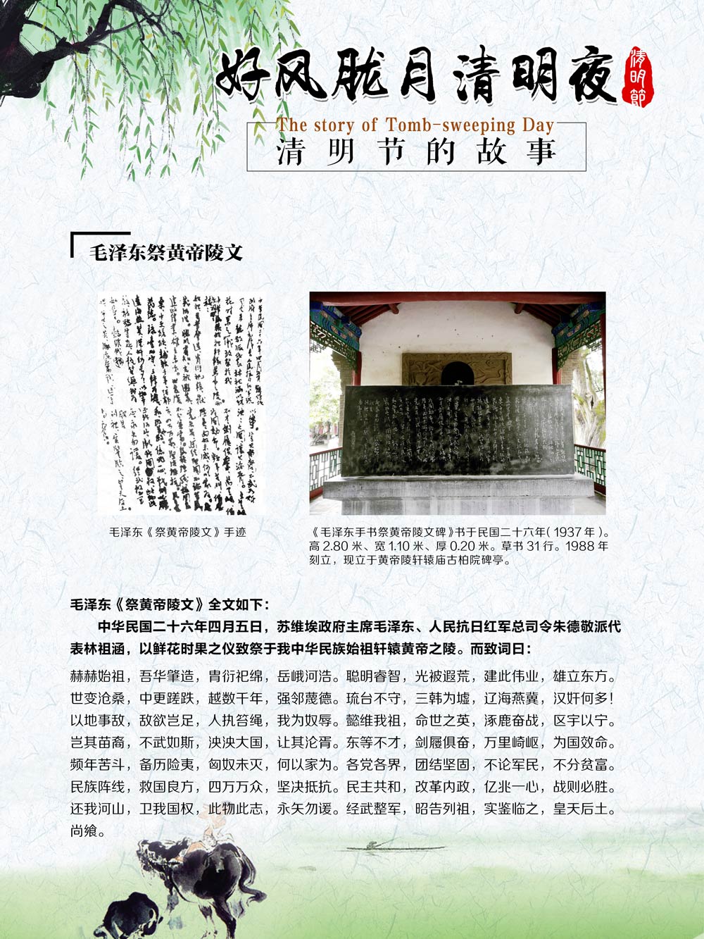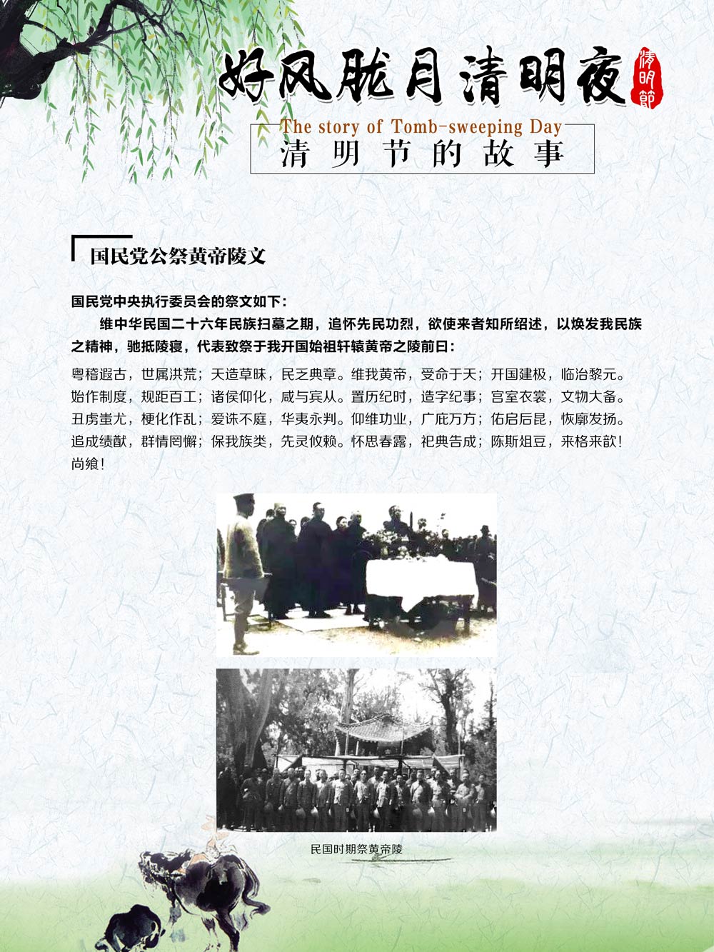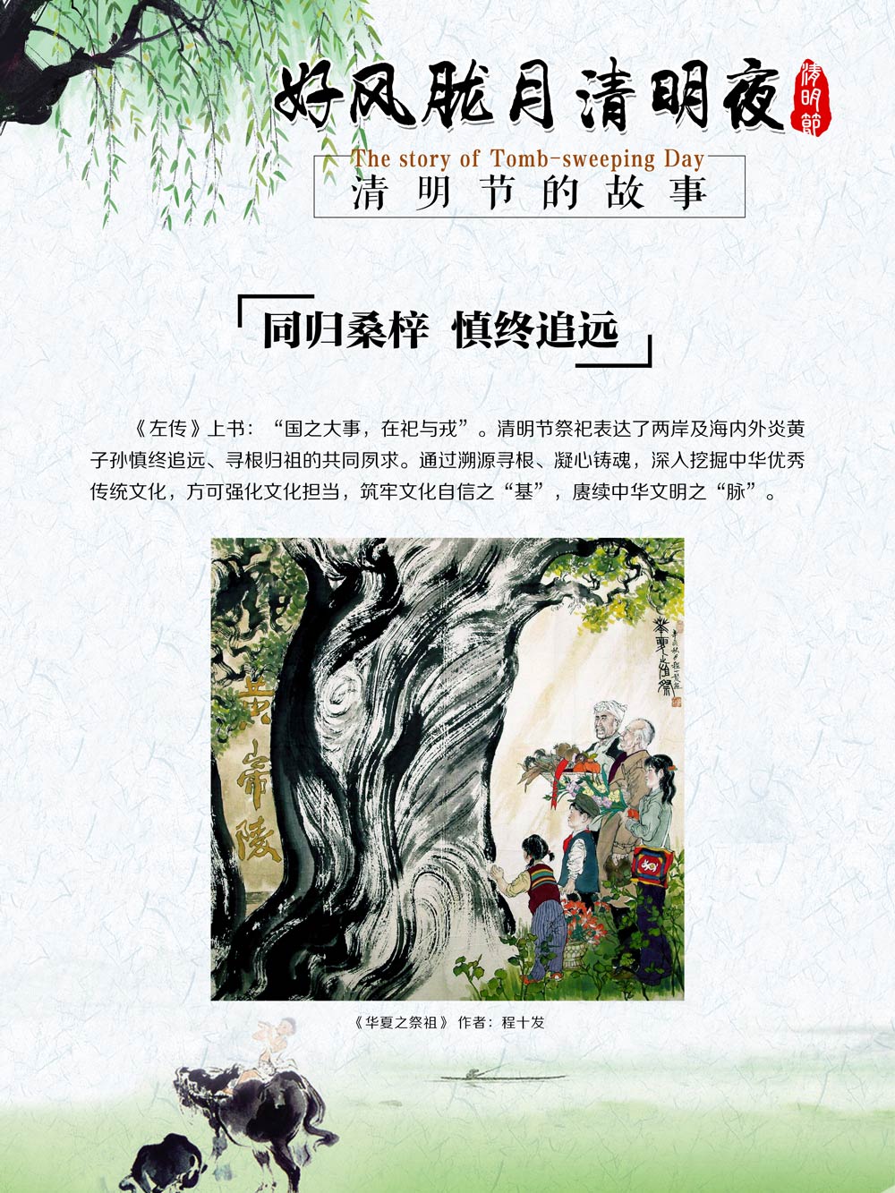 《好风胧月清明夜——清明节的故事》主题展览共分为五个单元:“节日溯源 有容乃大”“同归桑梓 慎终追远”“插柳踏春 环保健身”“清明知味 风俗食物”“吟咏绵延 清明永驻”,其中特别策划了“国共两党公祭黄帝陵”、“毛泽东祭黄帝陵文”、“孙中山题词黄帝陵”、国家非物质文化遗产项目“大槐树祭祖习俗”、互动体验“网上祭英烈”和“踏青赏景找不同”六大看点,让您全方位多层次地体验清明节的文化内涵与风姿魅力。 春生孳乳,万物繁炽,天明地洁,气象清朗。时值农历阳春三月,清明节到来之际,我们特别举办此展览,以期在现代文明的催护下,共守传统文化根脉,共勉文明传承重任,为推动社会主义文化繁荣兴盛,贡献我们的智慧和力量。愿清明常在,民族不老。