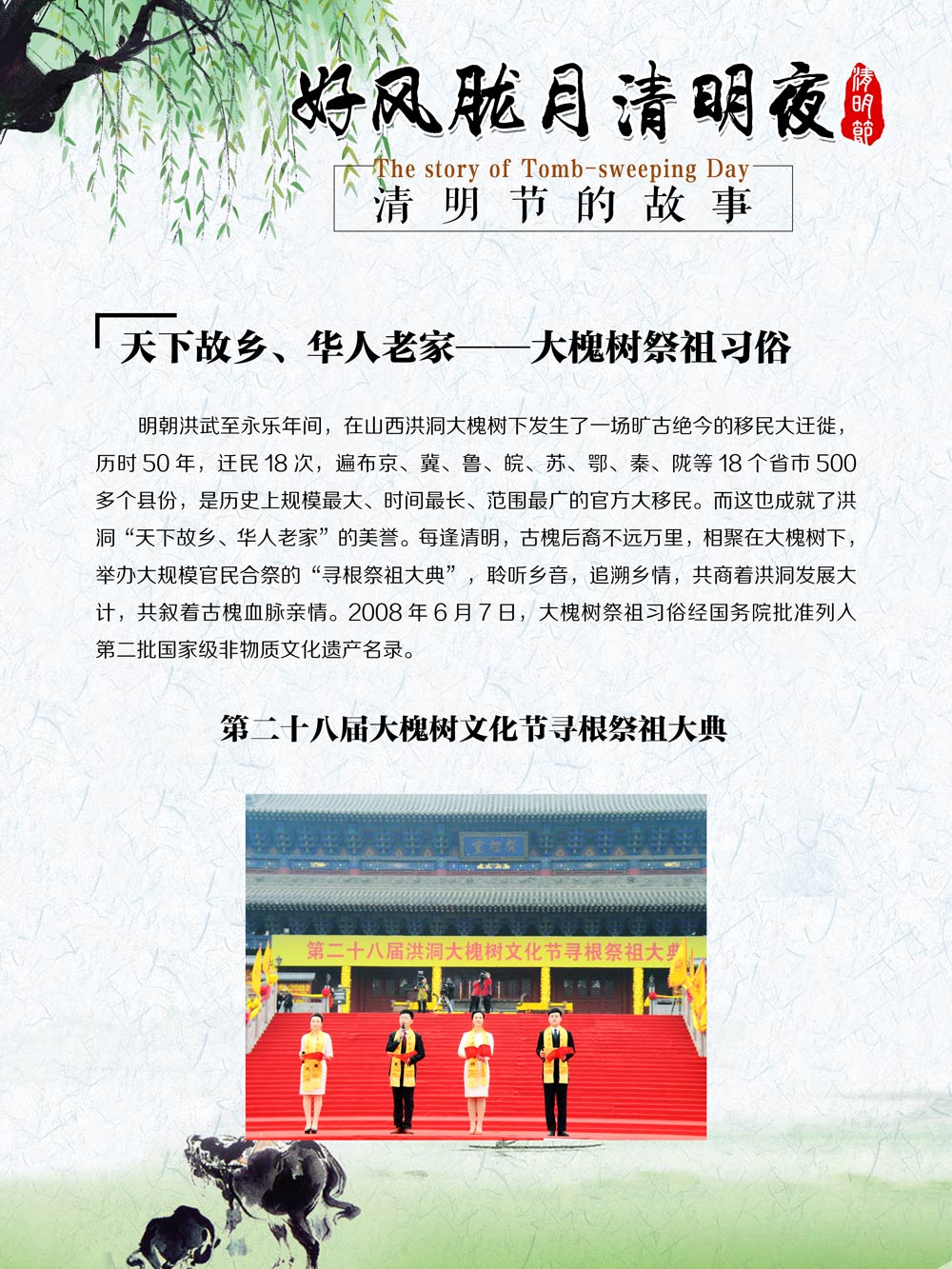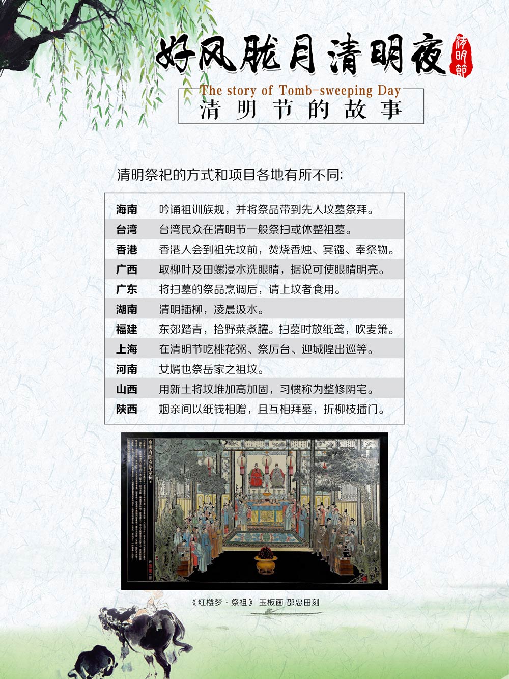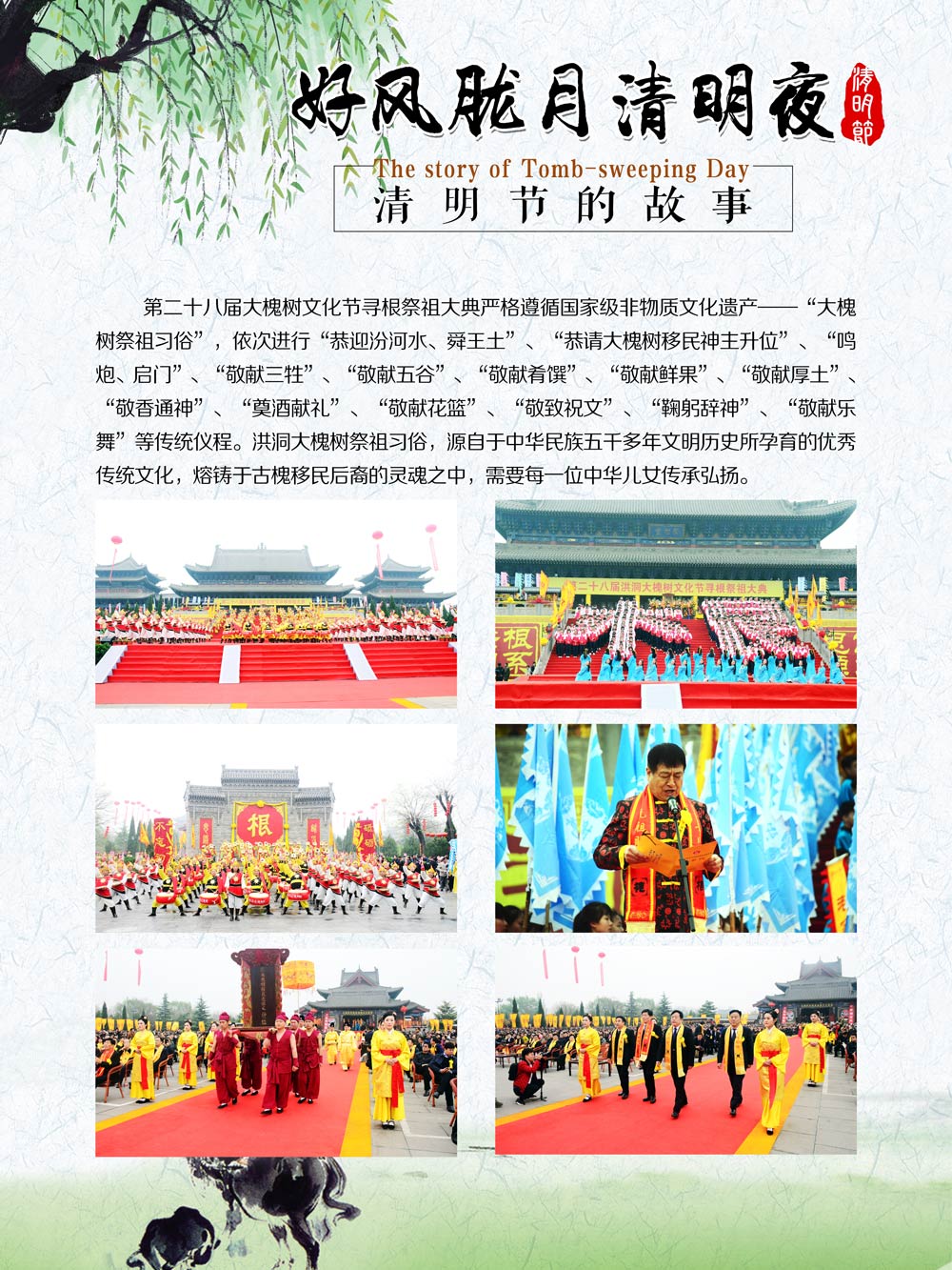 《好风胧月清明夜——清明节的故事》主题展览共分为五个单元:“节日溯源 有容乃大”“同归桑梓 慎终追远”“插柳踏春 环保健身”“清明知味 风俗食物”“吟咏绵延 清明永驻”,其中特别策划了“国共两党公祭黄帝陵”、“毛泽东祭黄帝陵文”、“孙中山题词黄帝陵”、国家非物质文化遗产项目“大槐树祭祖习俗”、互动体验“网上祭英烈”和“踏青赏景找不同”六大看点,让您全方位多层次地体验清明节的文化内涵与风姿魅力。 春生孳乳,万物繁炽,天明地洁,气象清朗。时值农历阳春三月,清明节到来之际,我们特别举办此展览,以期在现代文明的催护下,共守传统文化根脉,共勉文明传承重任,为推动社会主义文化繁荣兴盛,贡献我们的智慧和力量。愿清明常在,民族不老。
