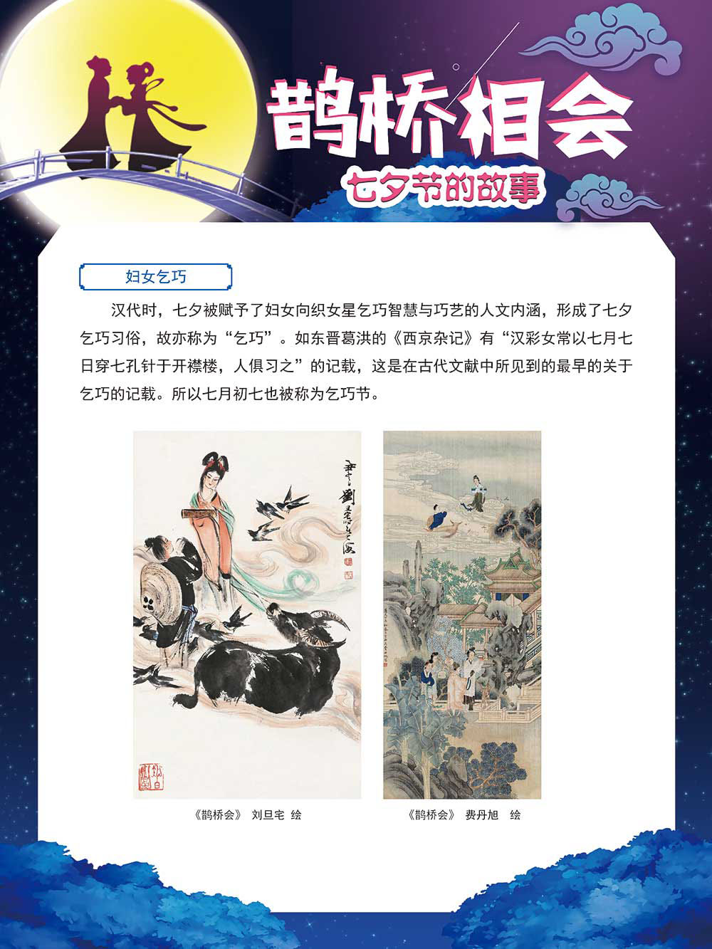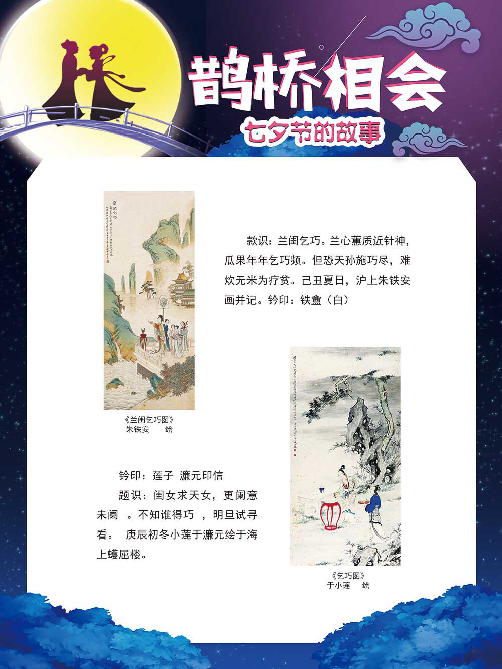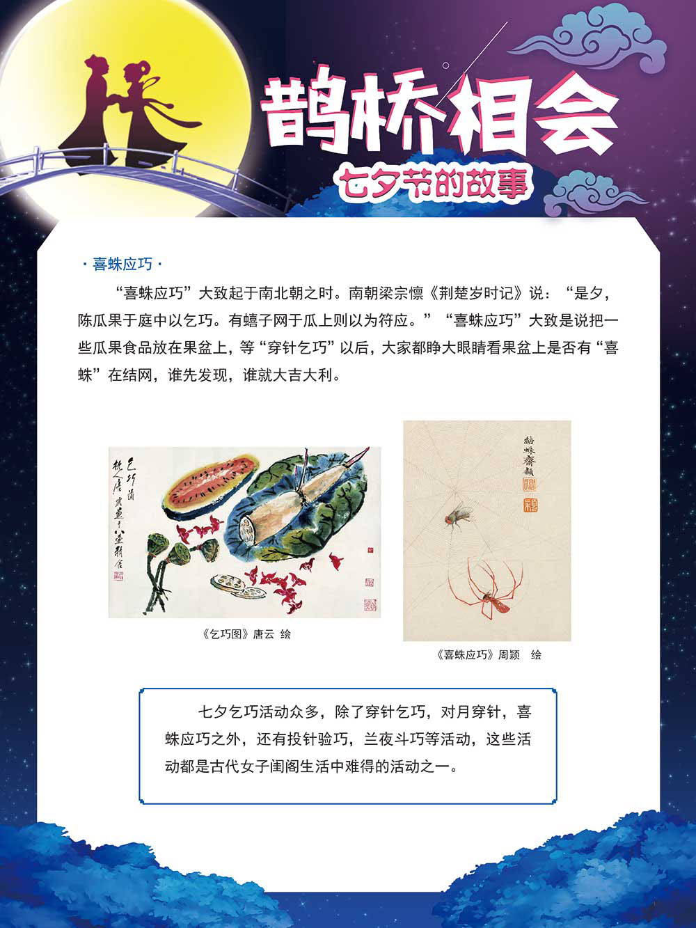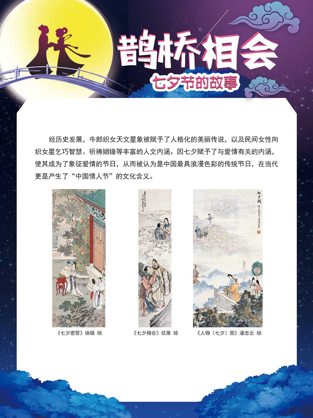 七夕节是中华民族重要的传统节日,在我国民间传统节日中是一个非常具有浪漫色彩的节日。自牛郎织女传说融入七夕节后,牛郎织女鹊桥相会的爱情故事流传千古,深入人心,这也就成为七夕节的主要内容。 2006年七夕节被国务院列入第一批国家级非物质文化遗产名录。“七夕节”是世界上最早的爱情节日,其体现的自由浪漫的爱情观、勤奋朴实的劳动观以及诠释的爱情永恒主题,彰显了传统文化的魅力。七夕文化中的乞巧、祈福活动体现了中华民族勤劳智慧、自强不息、勇于创造,不断追求更加幸福美好生活的精神。 本展览通过国画、连环画、摄影图像和七夕相关的诗歌等内容为您综合介绍七夕节文化内涵,以及民间的各种习俗和当下七夕节的传承和发展。