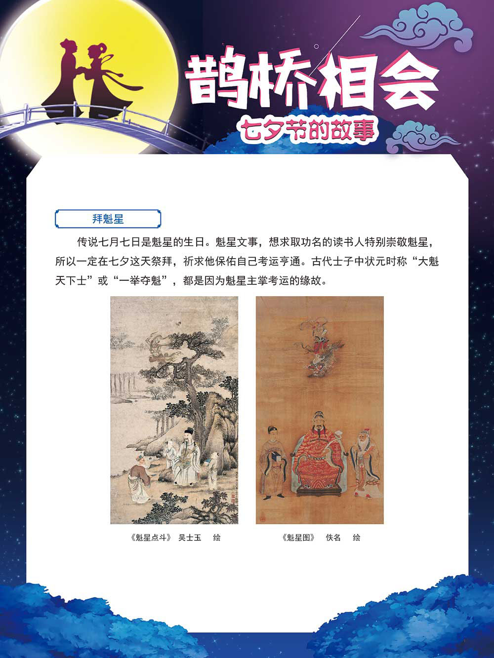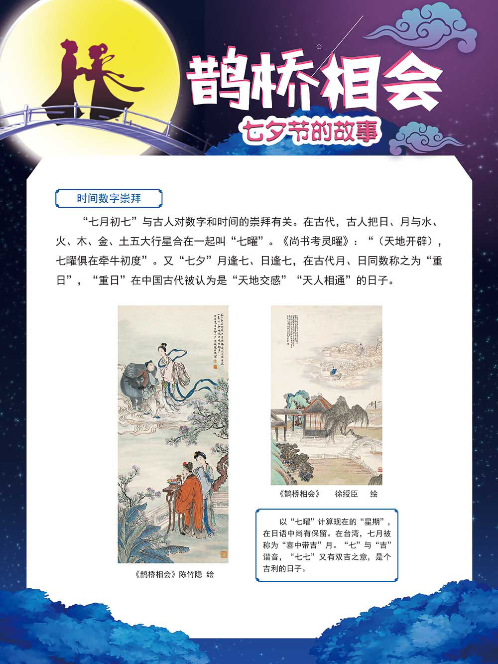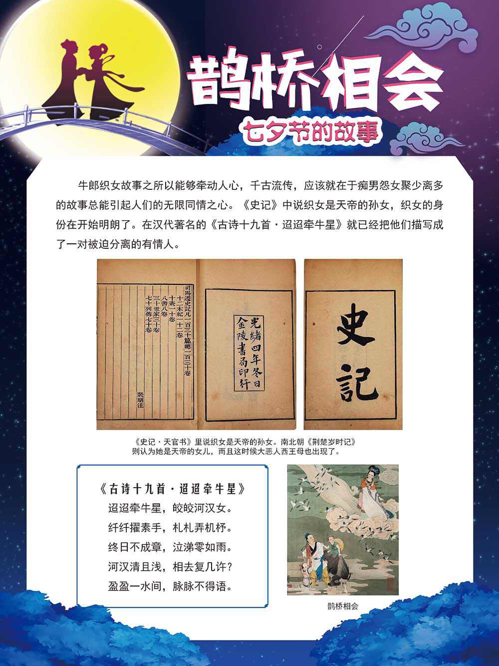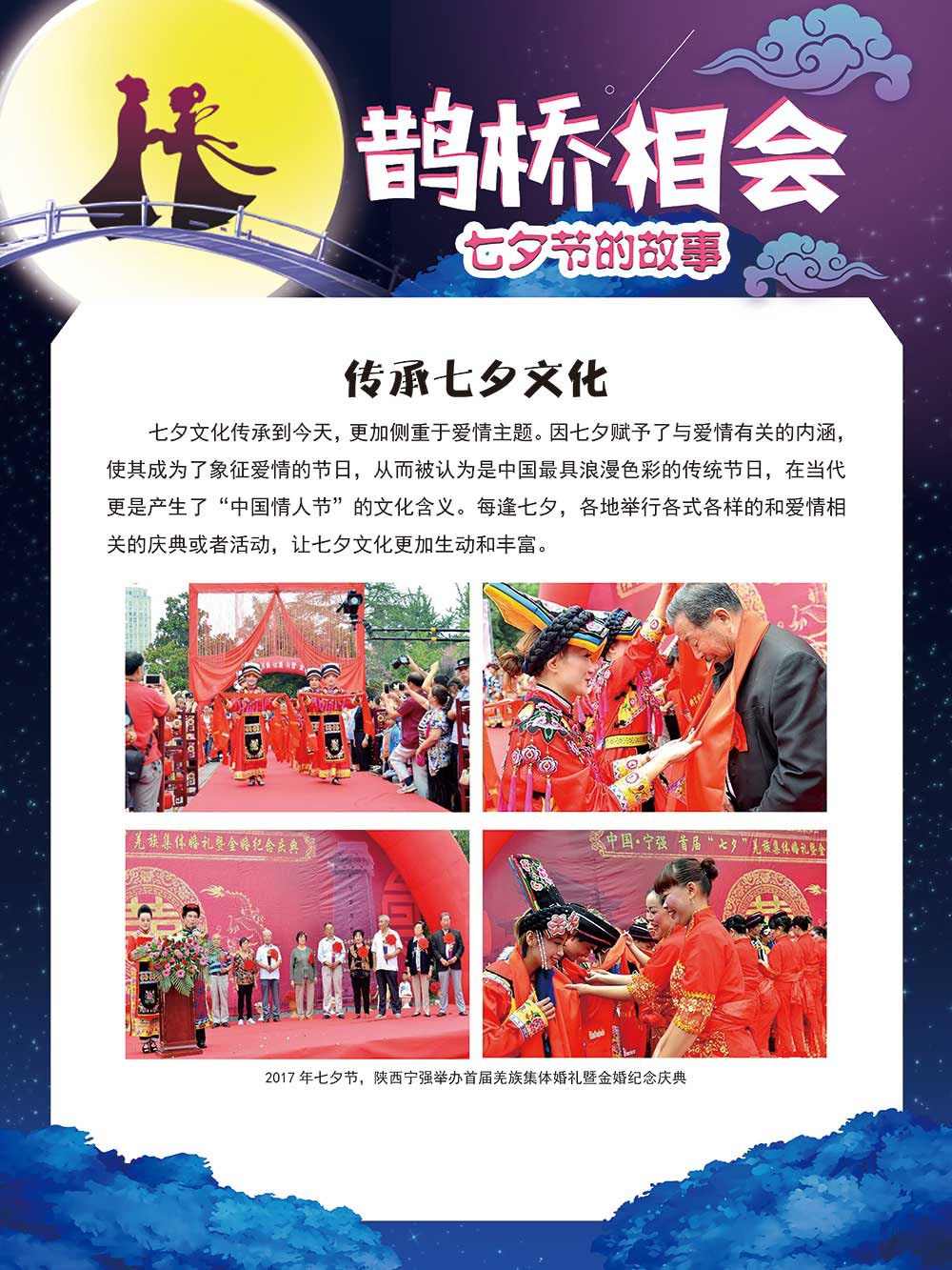 七夕节是中华民族重要的传统节日,在我国民间传统节日中是一个非常具有浪漫色彩的节日。自牛郎织女传说融入七夕节后,牛郎织女鹊桥相会的爱情故事流传千古,深入人心,这也就成为七夕节的主要内容。 2006年七夕节被国务院列入第一批国家级非物质文化遗产名录。“七夕节”是世界上最早的爱情节日,其体现的自由浪漫的爱情观、勤奋朴实的劳动观以及诠释的爱情永恒主题,彰显了传统文化的魅力。七夕文化中的乞巧、祈福活动体现了中华民族勤劳智慧、自强不息、勇于创造,不断追求更加幸福美好生活的精神。 本展览通过国画、连环画、摄影图像和七夕相关的诗歌等内容为您综合介绍七夕节文化内涵,以及民间的各种习俗和当下七夕节的传承和发展。