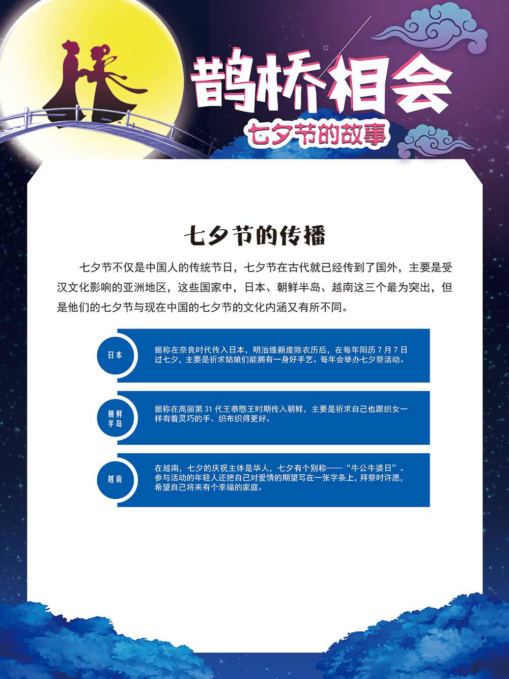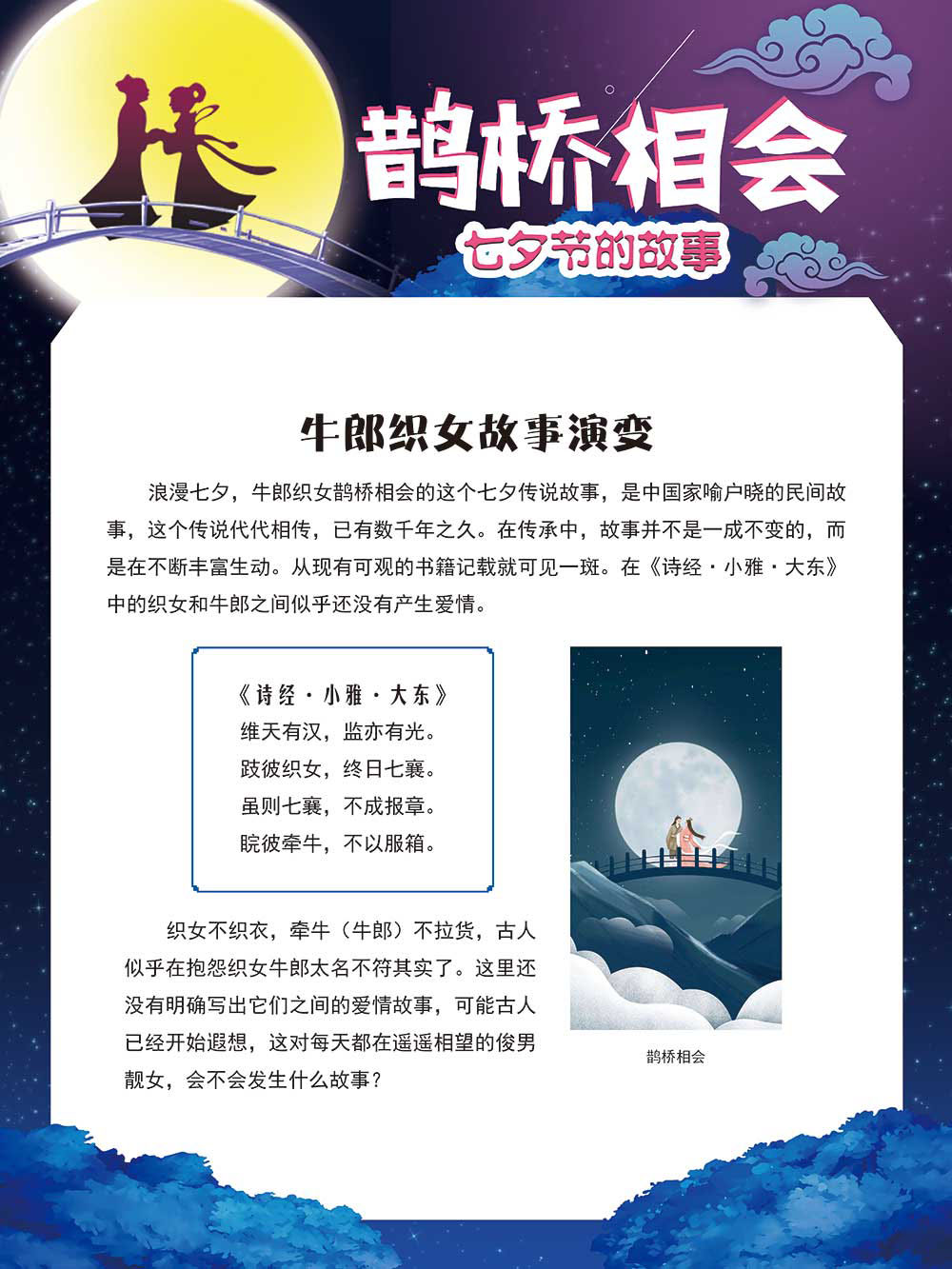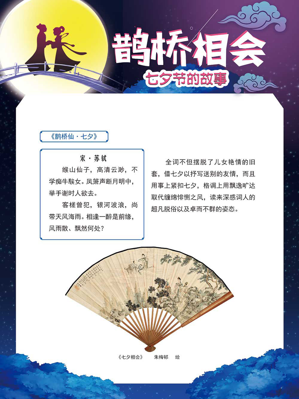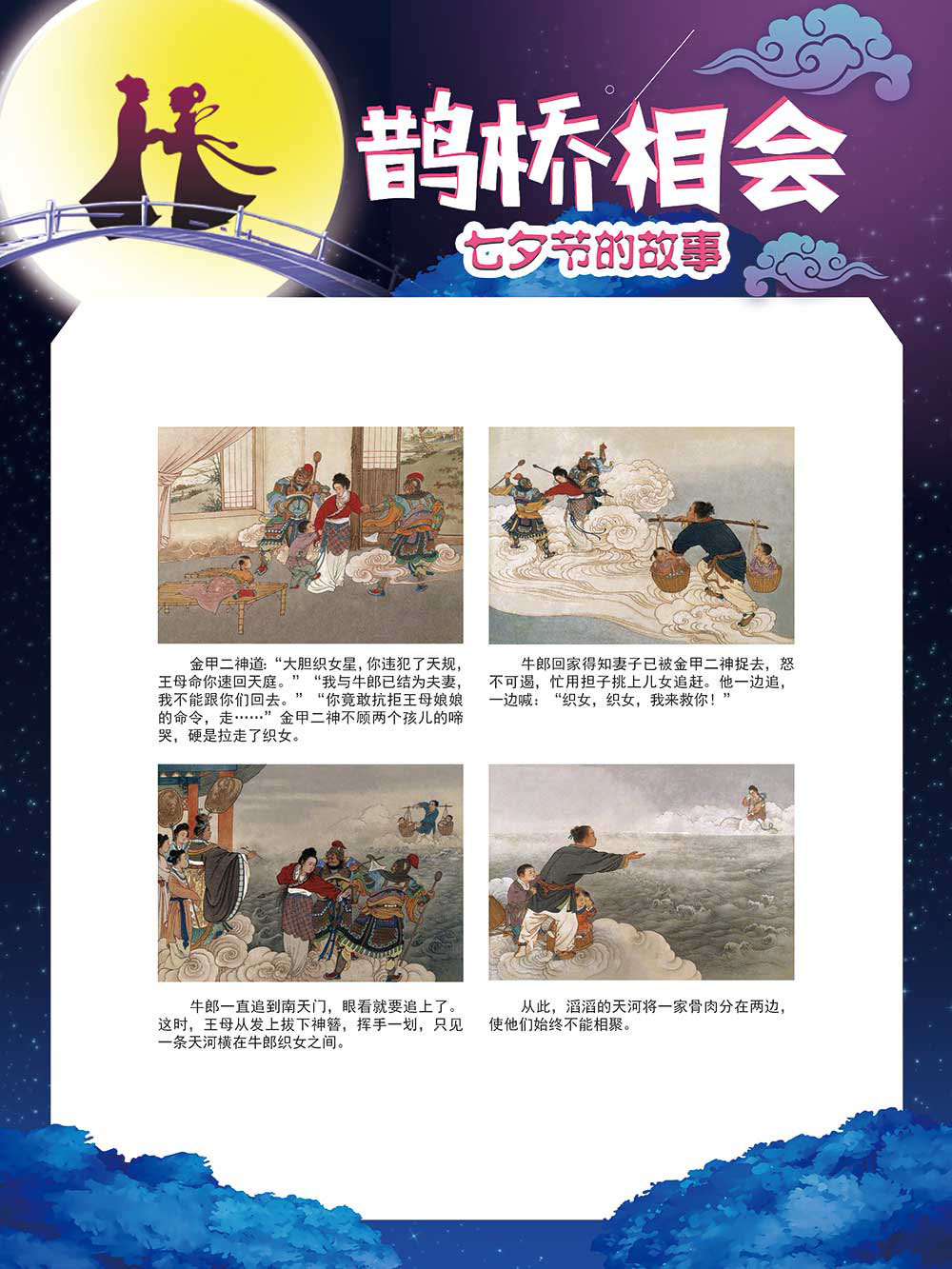 七夕节是中华民族重要的传统节日,在我国民间传统节日中是一个非常具有浪漫色彩的节日。自牛郎织女传说融入七夕节后,牛郎织女鹊桥相会的爱情故事流传千古,深入人心,这也就成为七夕节的主要内容。 2006年七夕节被国务院列入第一批国家级非物质文化遗产名录。“七夕节”是世界上最早的爱情节日,其体现的自由浪漫的爱情观、勤奋朴实的劳动观以及诠释的爱情永恒主题,彰显了传统文化的魅力。七夕文化中的乞巧、祈福活动体现了中华民族勤劳智慧、自强不息、勇于创造,不断追求更加幸福美好生活的精神。 本展览通过国画、连环画、摄影图像和七夕相关的诗歌等内容为您综合介绍七夕节文化内涵,以及民间的各种习俗和当下七夕节的传承和发展。
