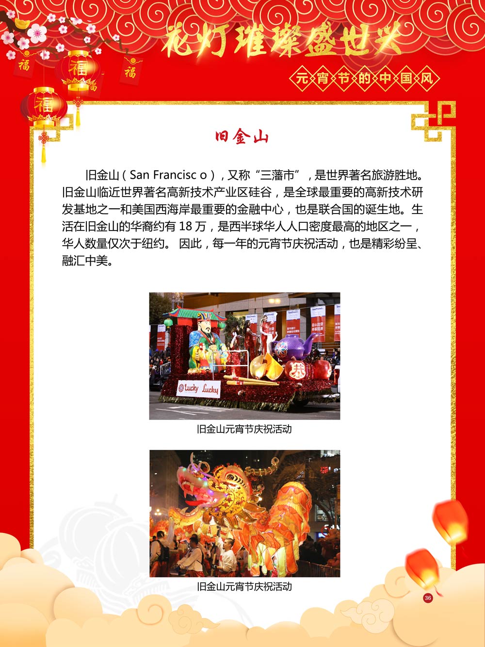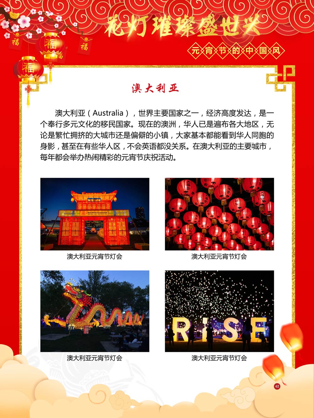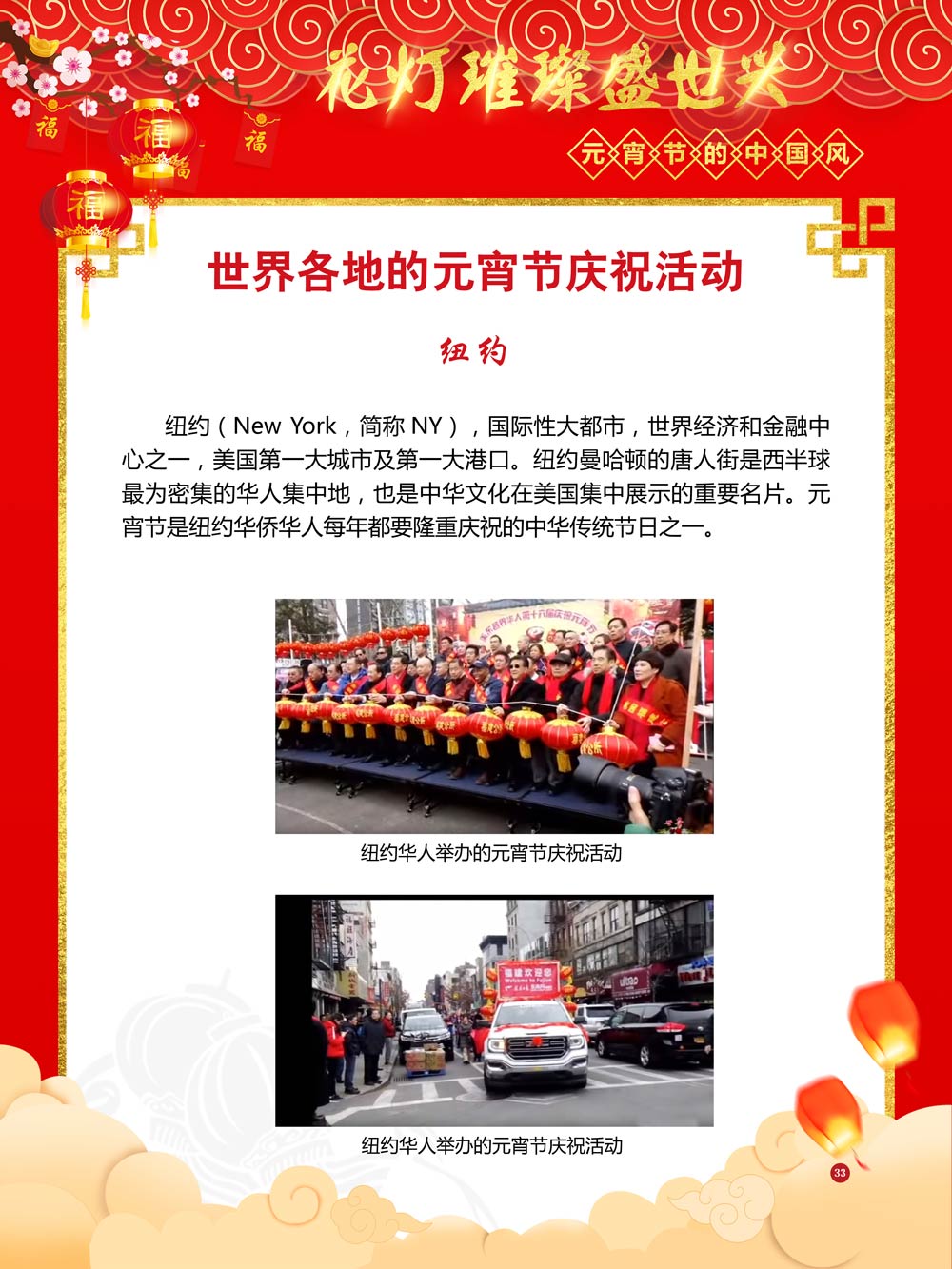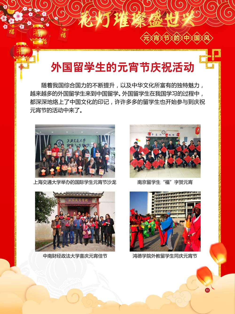 过完春节过十五,正月十五闹元宵!一年一度的元宵节又要喜气洋洋的登场了!值此佳节来临之际,我们首先给大家拜一个晚年,同时祝愿大家元宵节快乐!元宵节的历史源远流长,形成了其富有特色的节日风情,是中华民族的重要传统节日之一。 随着全球化时代到来后,全世界的各大文明形态和多种多样的文化迎来了有史以来最大的深度融合。中华传统文化也乘着文化全球化的快车,通过遍布世界各地的华侨华人传播到了世界上的每一个角落。元宵节也在此背景下,由一个中华传统节日逐渐的发展为一个具有浓重现代多元气息的世界节日。元宵节的庆祝活动也不在仅仅局限在中华文化圈内,而是逐渐地扩大到了更大的国际范围中。越来越多的世界各地居民领略到了我国元宵节独特的魅力风采,而且也在逐渐地加深理解元宵节蕴含的丰富内涵。各色皮肤和各种语言的人们越来越积极地加入到庆祝元宵节的队伍中来,丰富多彩的国外文化也随之自然融入到传统的中华元宵节文化中去。 今天,庆祝元宵佳节的活动已经在世界各地如雨后春笋般出现,元宵节已经成为了富有鲜明中国风的重要东方文化符号。我们将通过本展为广大观众朋友们呈现这一幅幅张灯结彩且充满欢声笑语的精美画卷。