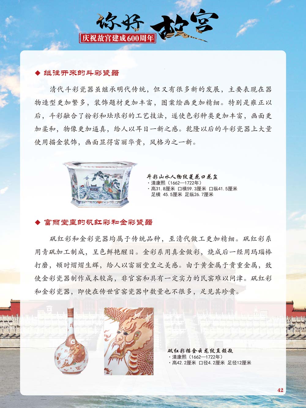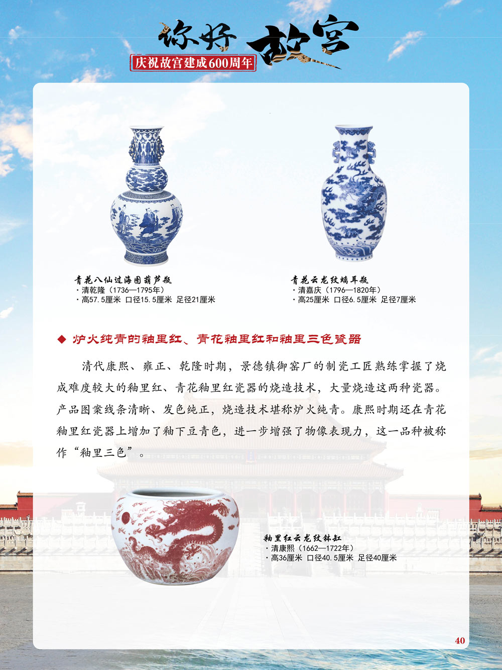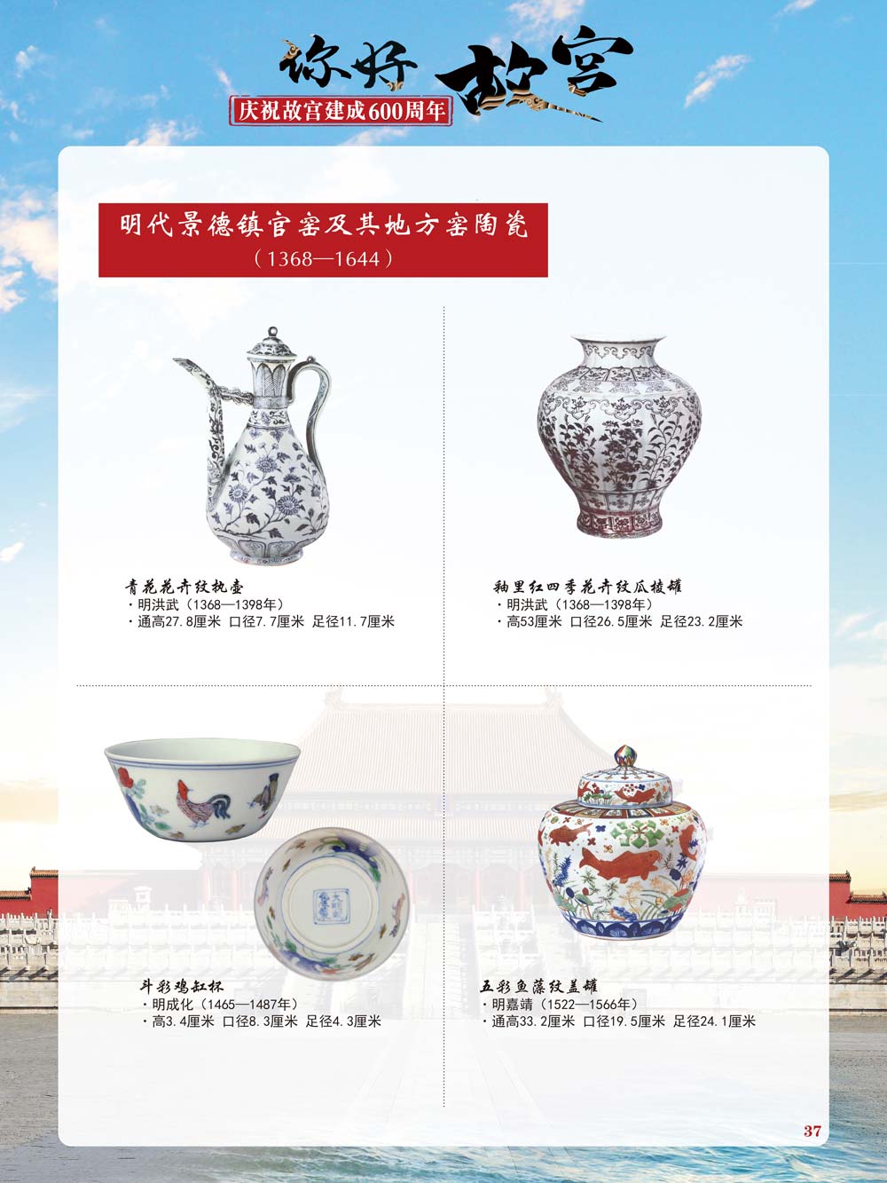 故宫是了解中国历史文化不可或缺的窗口。它其实有两个名字,一个名叫故宫博物院,90多岁了;一个名叫紫禁城,今年整整600岁了。 历史文物承载着一个民族的灿烂文明,本展览立足于故宫建成600周年,通过介绍故宫的建筑、字画、陶瓷,让观众不仅可以欣赏精美的文物,还可以在历史的氛围中徜徉传承和发扬中华优秀传统文化。故宫的每一座宫殿建筑、朱漆大门、院落桥梁、青砖黄瓦、宫廷陈设、梁枋彩画,承载着丰富的历史符号、文化内涵。书画藏品是故宫博物院艺术藏品的重中之重,阎立本《步辇图》,张择端《清明上河图》,王羲之、欧阳询等名家书法成为故宫镇院之宝。陶瓷,是文明的象征,每件作品背后的文化因素,让造型、釉色和装饰纹样呈现出丰富多元的面貌。陶瓷吸引人之处,在于它们呼应着源远流长的历史脉络,同时也反映出不同文化相互交流的现象。