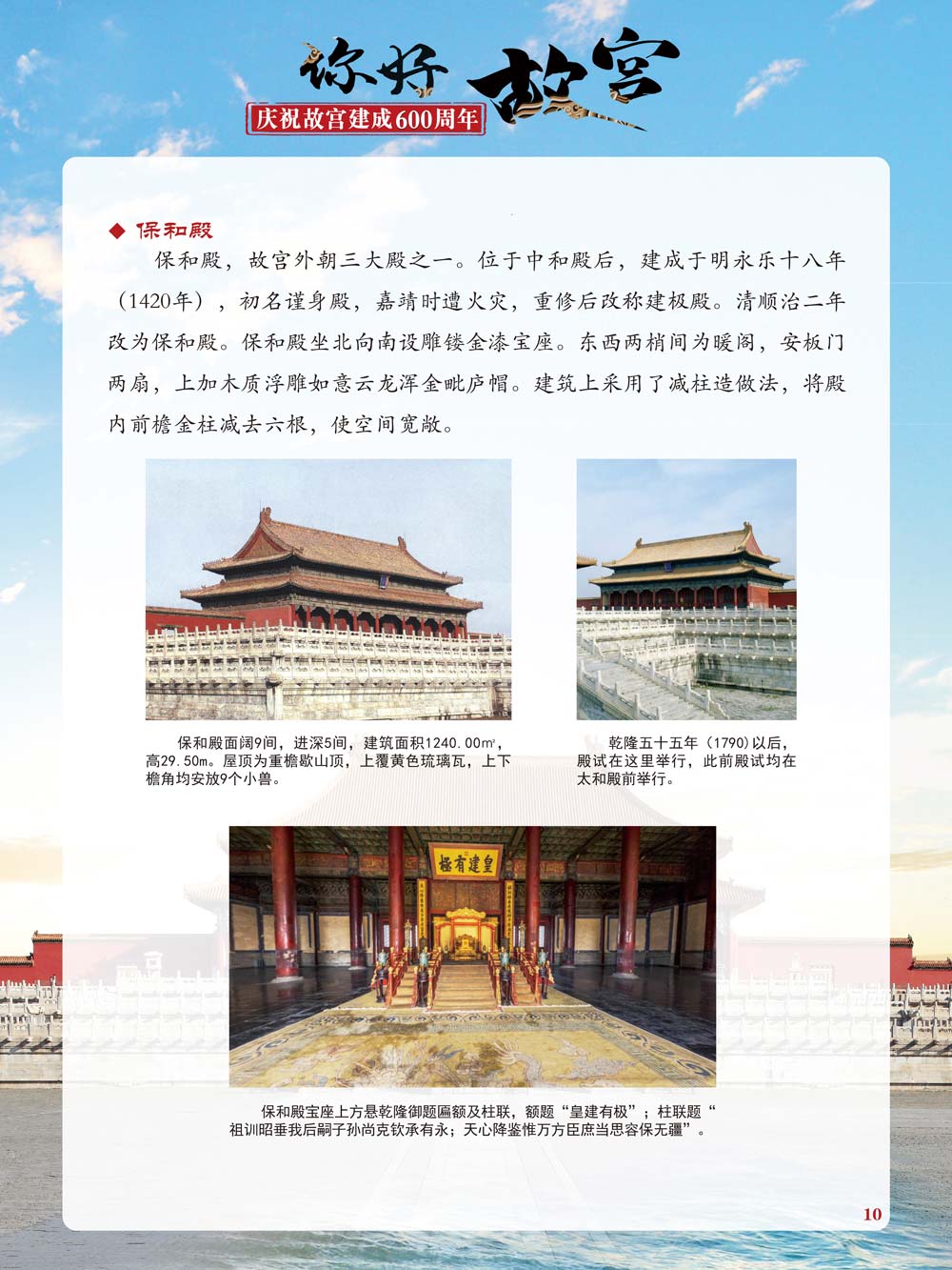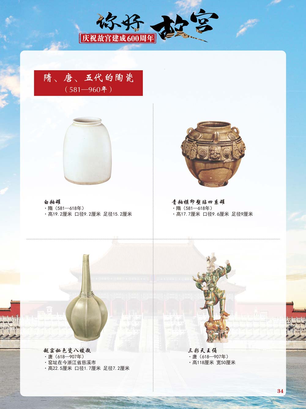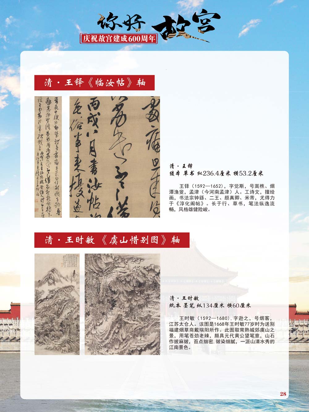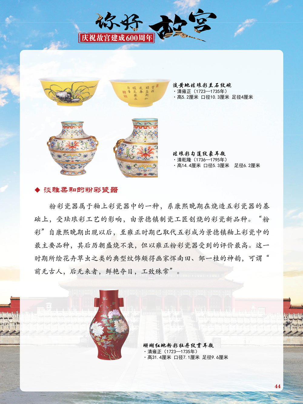 故宫是了解中国历史文化不可或缺的窗口。它其实有两个名字,一个名叫故宫博物院,90多岁了;一个名叫紫禁城,今年整整600岁了。 历史文物承载着一个民族的灿烂文明,本展览立足于故宫建成600周年,通过介绍故宫的建筑、字画、陶瓷,让观众不仅可以欣赏精美的文物,还可以在历史的氛围中徜徉传承和发扬中华优秀传统文化。故宫的每一座宫殿建筑、朱漆大门、院落桥梁、青砖黄瓦、宫廷陈设、梁枋彩画,承载着丰富的历史符号、文化内涵。书画藏品是故宫博物院艺术藏品的重中之重,阎立本《步辇图》,张择端《清明上河图》,王羲之、欧阳询等名家书法成为故宫镇院之宝。陶瓷,是文明的象征,每件作品背后的文化因素,让造型、釉色和装饰纹样呈现出丰富多元的面貌。陶瓷吸引人之处,在于它们呼应着源远流长的历史脉络,同时也反映出不同文化相互交流的现象。