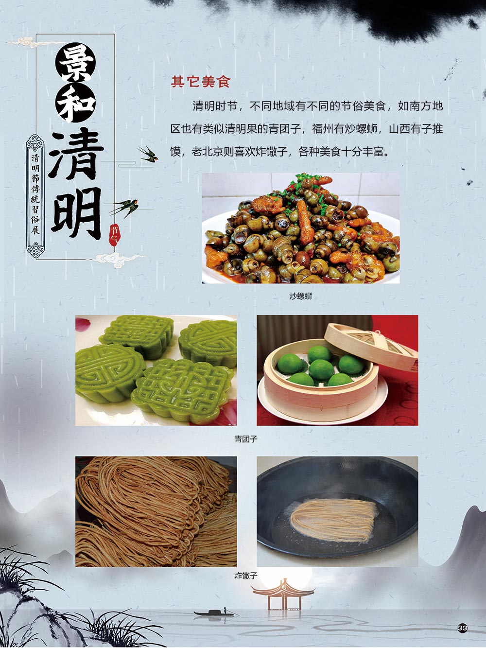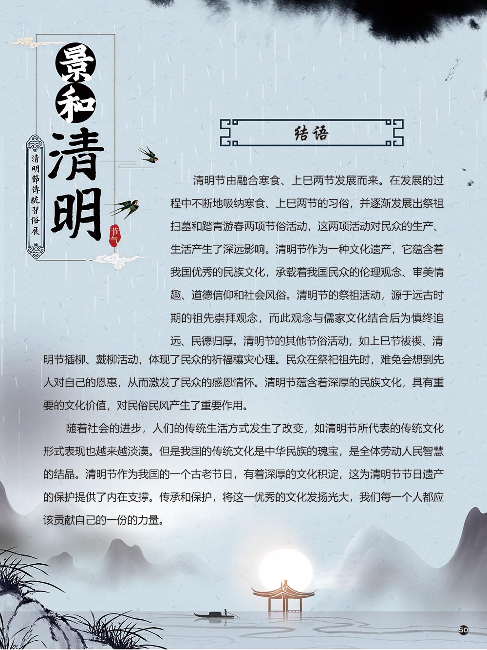 清明节是中华民族传统节日中一个由节气命名的节日。清明节的文化内涵传承着中华民族独特的精神与情感。古往今来,清明节作为中国忠孝文化的载体,对家庭的尊崇,对祖先的感恩,对血脉责任的认同,使其在我国民俗节日体系中具有不可替代的地位。 清明节蕴含着我国优秀的民族文化,承载着我国民众的伦理观念、审美情趣、道德信仰和社会风俗。 在上千年的历史发展中,清明节这一古老的传统节日,随时代而变化。尤其是在当今社会,清明节的发展呈现出新态势。如政府组织学校或单位在清明节去革命烈士陵园扫墓,缅怀为新中国浴血奋战的革命先烈;数以万计的海外侨胞在清明节回国,祭拜人类始祖轩辕黄帝。 2006年5月20日,文化部申报的清明节经国务院批准列入第一批国家级非物质文化遗产名录。清明节习俗甚多,全国各地因地域文化不同而又存在着习俗内容上或细节上的差异,各地习俗虽不尽相同,但扫墓祭祖、踏青郊游是共同的基本节俗主题。展览主要介绍清明节的起源及发展和习俗文化,以此讲述清明节日故事,弘扬传统文化。
