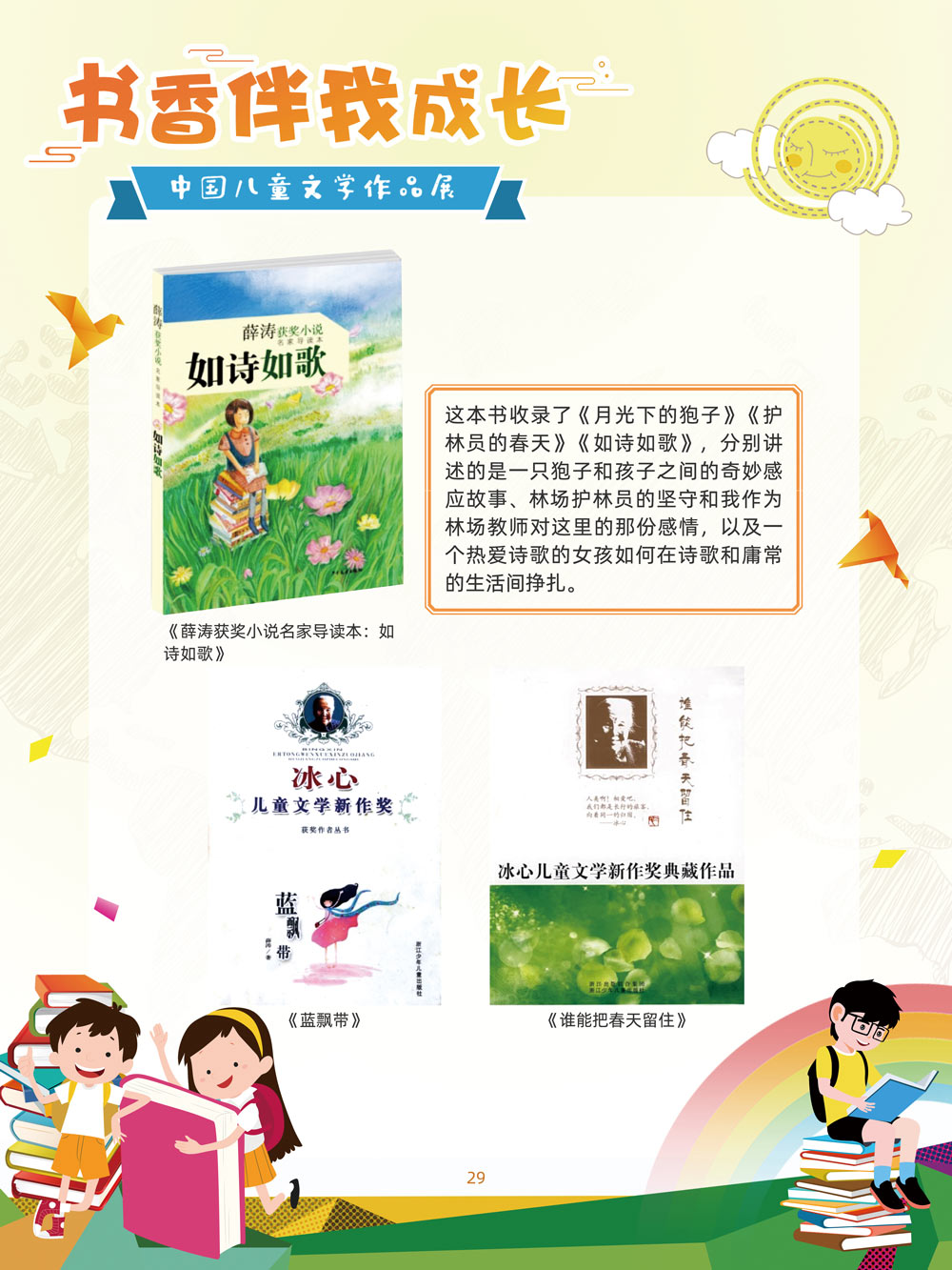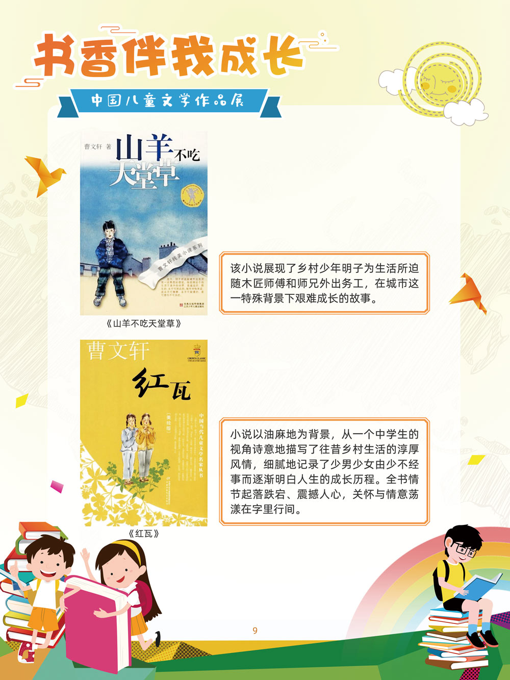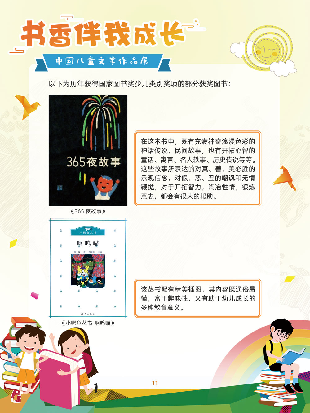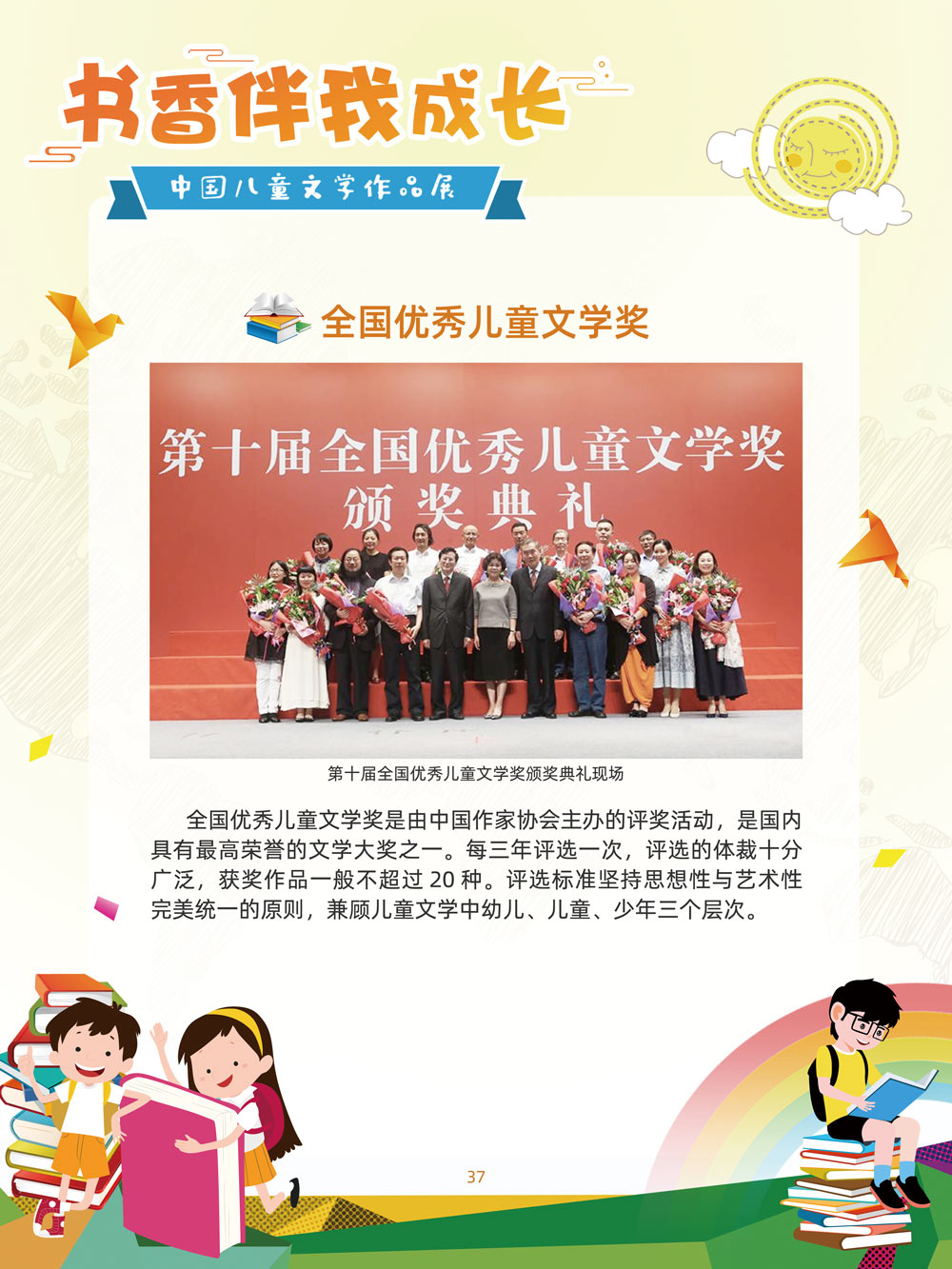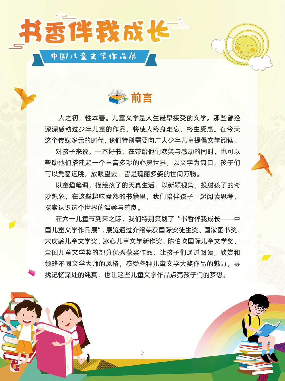 人之初,性本善。儿童文学是人生最早接受的文学。那些曾经深深感动过少年儿童的作品,将使人终身难忘,终生受惠。在今天这个传媒多元的时代,我们特别需要向广大少年儿童提倡文学阅读。 对孩子来说,一本好书,在带给他们欢笑与感动的同时,也可以帮助他们搭建起一个丰富多彩的心灵世界,以文字为窗口,孩子们可以凭窗远眺,放眼望去,皆是瑰丽多姿的世间万物。 以童趣笔调,描孩子的天真生活,以新颖视角,投射孩子的奇妙想象,在这些趣味盎然的书籍里,我们陪伴孩子一起阅读思考,探索认识这个世界的温柔与善良。 在“六一”儿童节到来之际,此次展览将最好的儿童文学作品介绍给广大少年儿童通过介绍荣获国际安徒生奖、国家图书奖、宋庆龄儿童文学奖、冰心儿童文学新作奖、陈伯吹国际儿童文学奖、全国儿童文学奖的部分优秀获奖作品,让孩子们通过阅读,赏和领略不同文学大师的风格,感受各种儿童文学大奖作品的魅力,寻找记忆深处的纯真,也让这些儿童文化作品点亮孩子们的梦想。