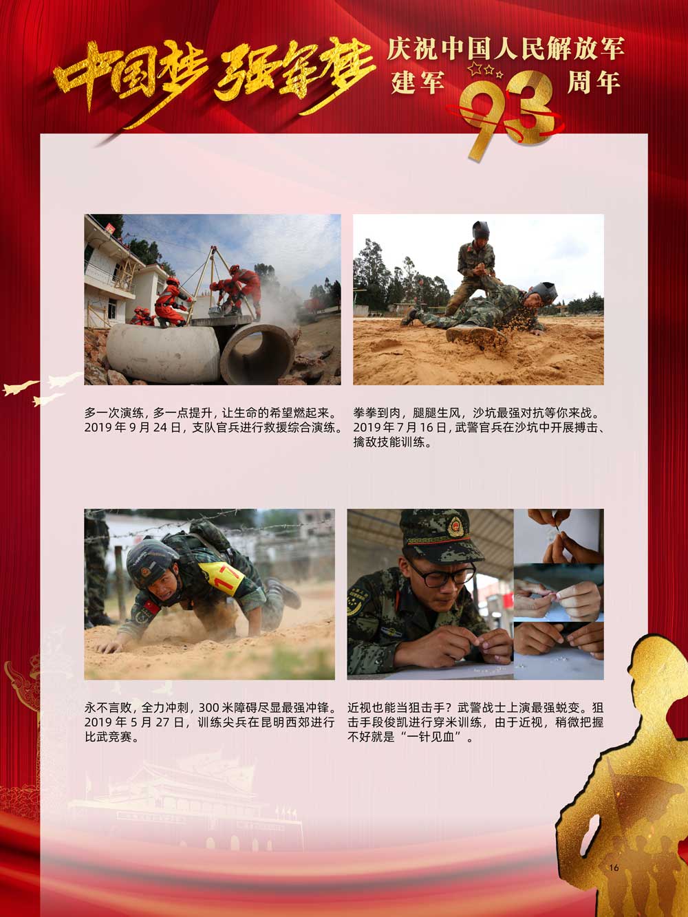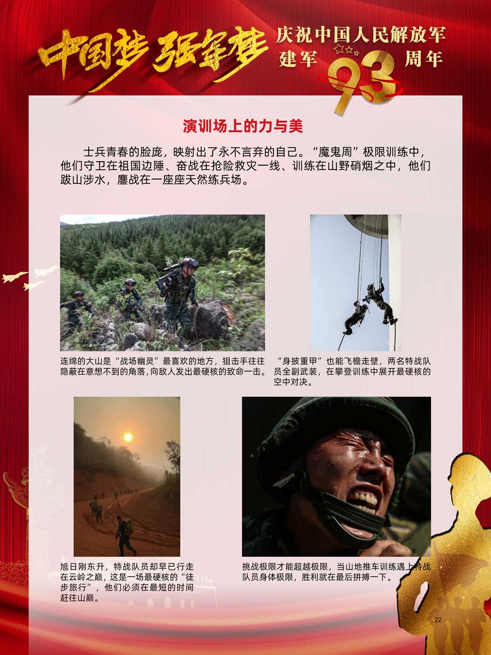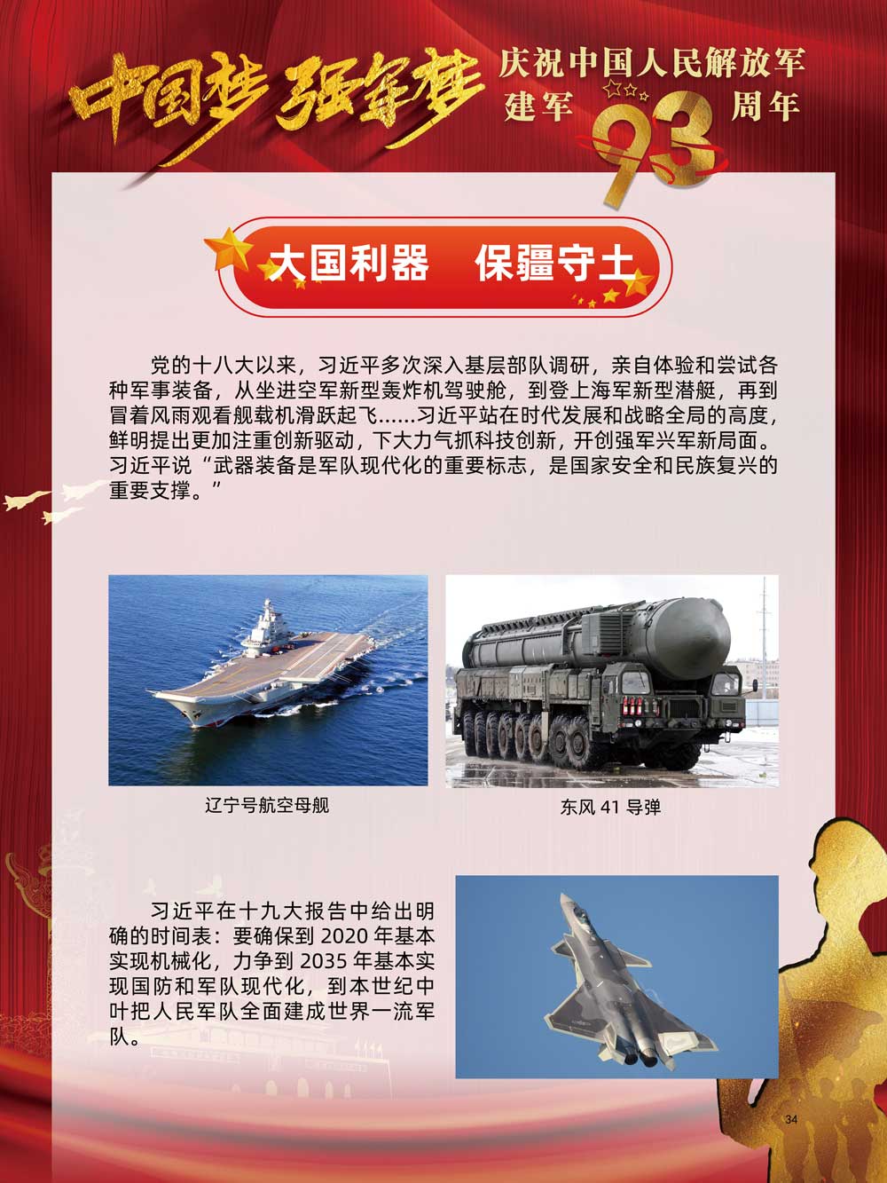 中国梦,强军梦。同根生,同心圆。 在十九大报告中有一句重要的表述,实现中国梦强军梦,把中国梦和强军梦放在一起表述和推进。在新时代国家安全形势面临着复杂严峻的局面,我们要实现中华民族伟大复兴的中国梦,对安全需求、安全保障提出了更高的要求。在这样一个背景下,建设强大军队的历史任务就前所未有地提出了。 中国梦和强军梦,是相互支持、相互支撑的关系。中国梦为强军梦提供强大的支撑,因为我们国家如果不能富强,我们就不可能有足够的资源来用于国防和军队建设。所以建设一支强大的军队必须要以中国梦的实现、要以国家的富强来作为前提,只有“富国强军”,中国梦最终才能实现。强军是中华民族伟大复兴的重要基石。富国和强军是中华民族伟大复兴的两大基石。富国是强军的基本依托,强军是富国的安全保障。强军梦不圆,中国梦也难圆。雄厚的经济实力是一个国家强大的基础,但倘若没有相应的国防实力和军事能力作后盾,经济实力再强大也不能成就真正意义上的中国梦。 今年是中国人民解放军建军93年,为庆祝中国人民解放军建军93周年,我们特别策划本展览,向您介绍中国梦强军梦的理论关系,介绍习近平强军的思想,向您展示中国人民解放军刻苦训练的飒爽英姿和自主创新的国产武器,以及其乐融融的军民鱼水情。