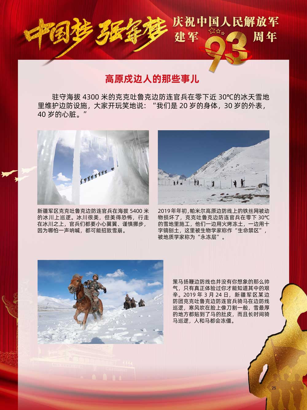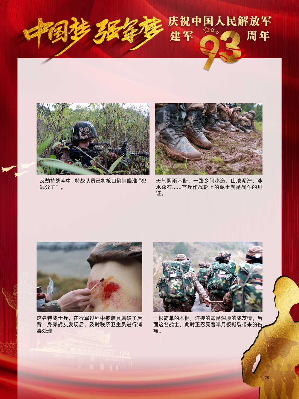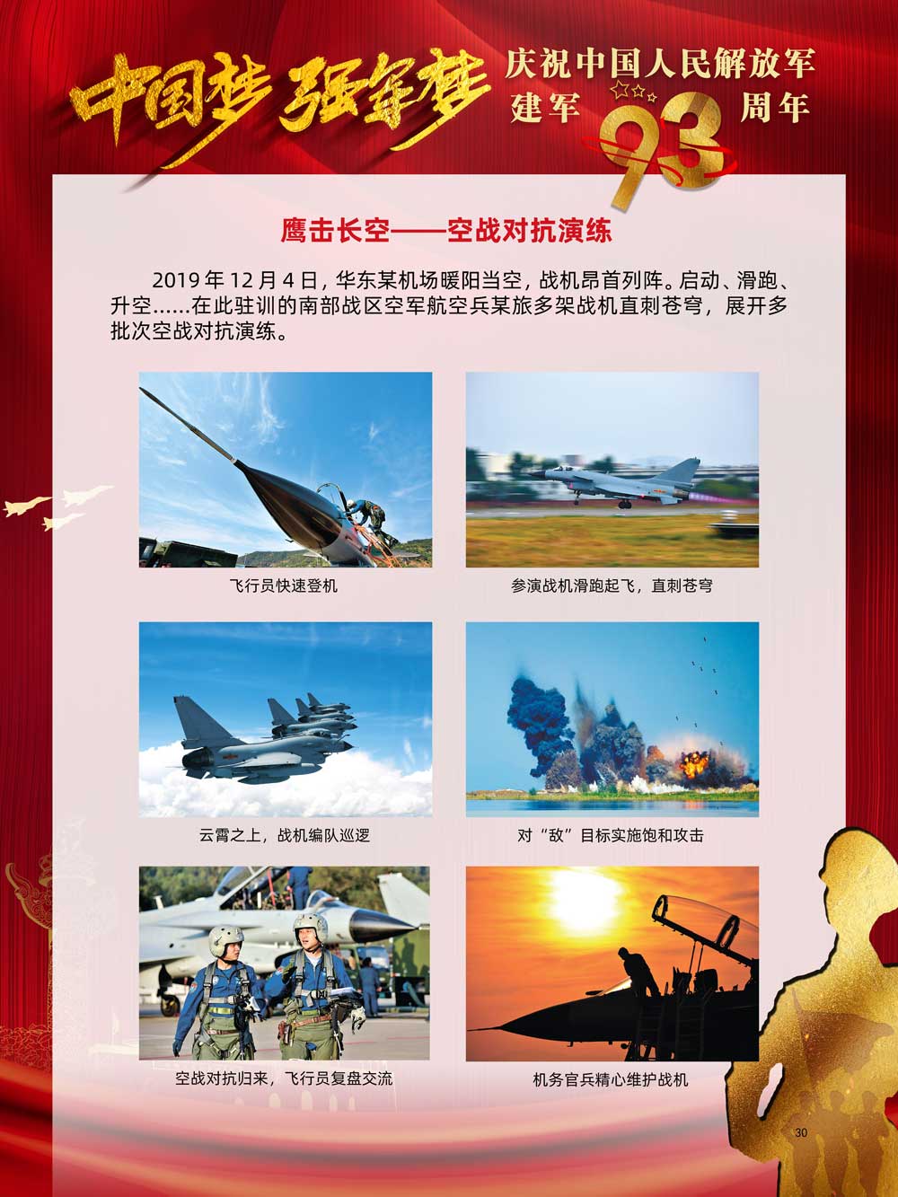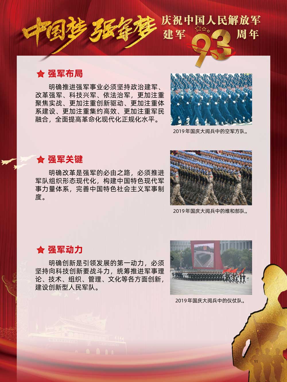 中国梦,强军梦。同根生,同心圆。 在十九大报告中有一句重要的表述,实现中国梦强军梦,把中国梦和强军梦放在一起表述和推进。在新时代国家安全形势面临着复杂严峻的局面,我们要实现中华民族伟大复兴的中国梦,对安全需求、安全保障提出了更高的要求。在这样一个背景下,建设强大军队的历史任务就前所未有地提出了。 中国梦和强军梦,是相互支持、相互支撑的关系。中国梦为强军梦提供强大的支撑,因为我们国家如果不能富强,我们就不可能有足够的资源来用于国防和军队建设。所以建设一支强大的军队必须要以中国梦的实现、要以国家的富强来作为前提,只有“富国强军”,中国梦最终才能实现。强军是中华民族伟大复兴的重要基石。富国和强军是中华民族伟大复兴的两大基石。富国是强军的基本依托,强军是富国的安全保障。强军梦不圆,中国梦也难圆。雄厚的经济实力是一个国家强大的基础,但倘若没有相应的国防实力和军事能力作后盾,经济实力再强大也不能成就真正意义上的中国梦。 今年是中国人民解放军建军93年,为庆祝中国人民解放军建军93周年,我们特别策划本展览,向您介绍中国梦强军梦的理论关系,介绍习近平强军的思想,向您展示中国人民解放军刻苦训练的飒爽英姿和自主创新的国产武器,以及其乐融融的军民鱼水情。