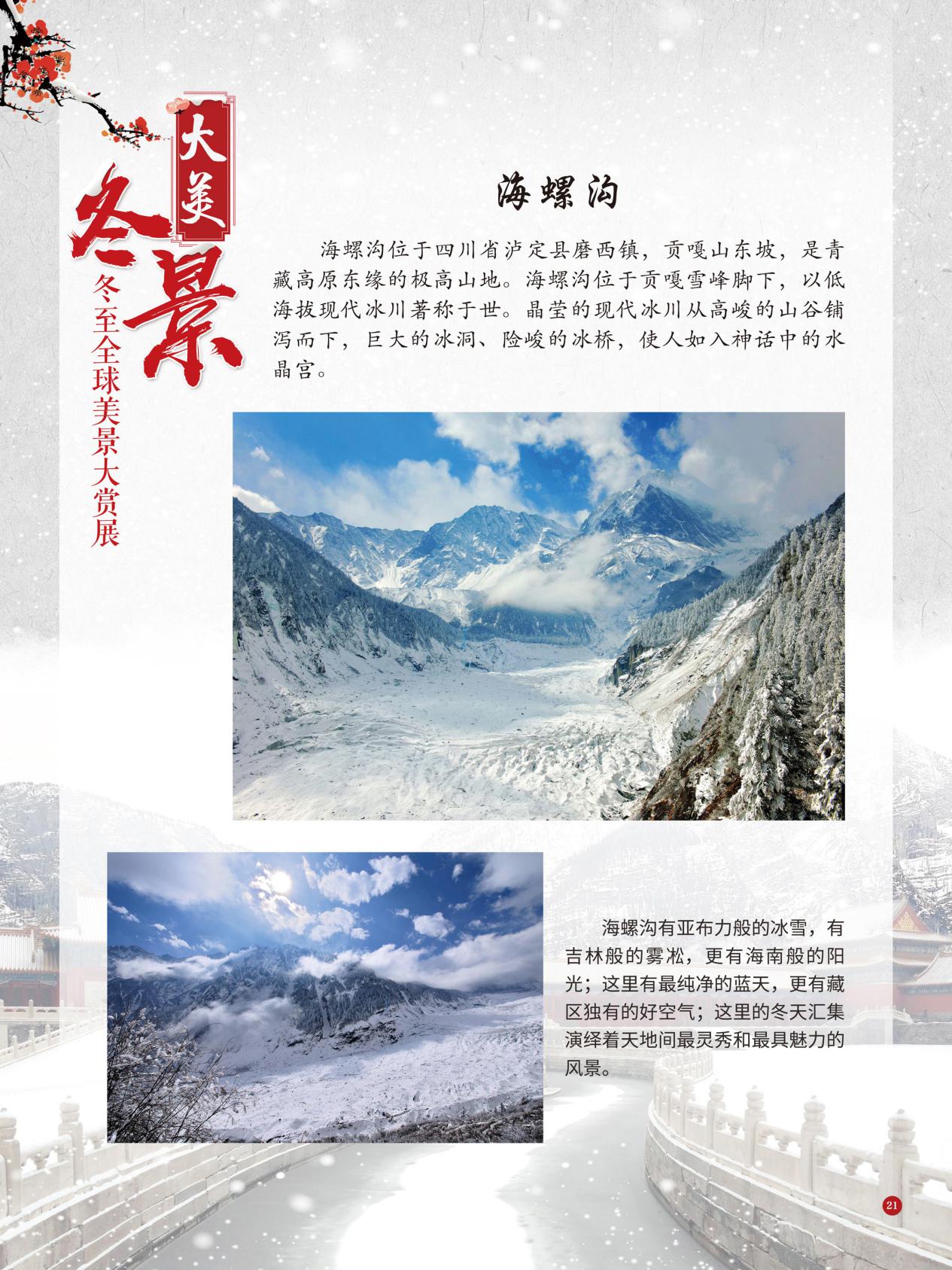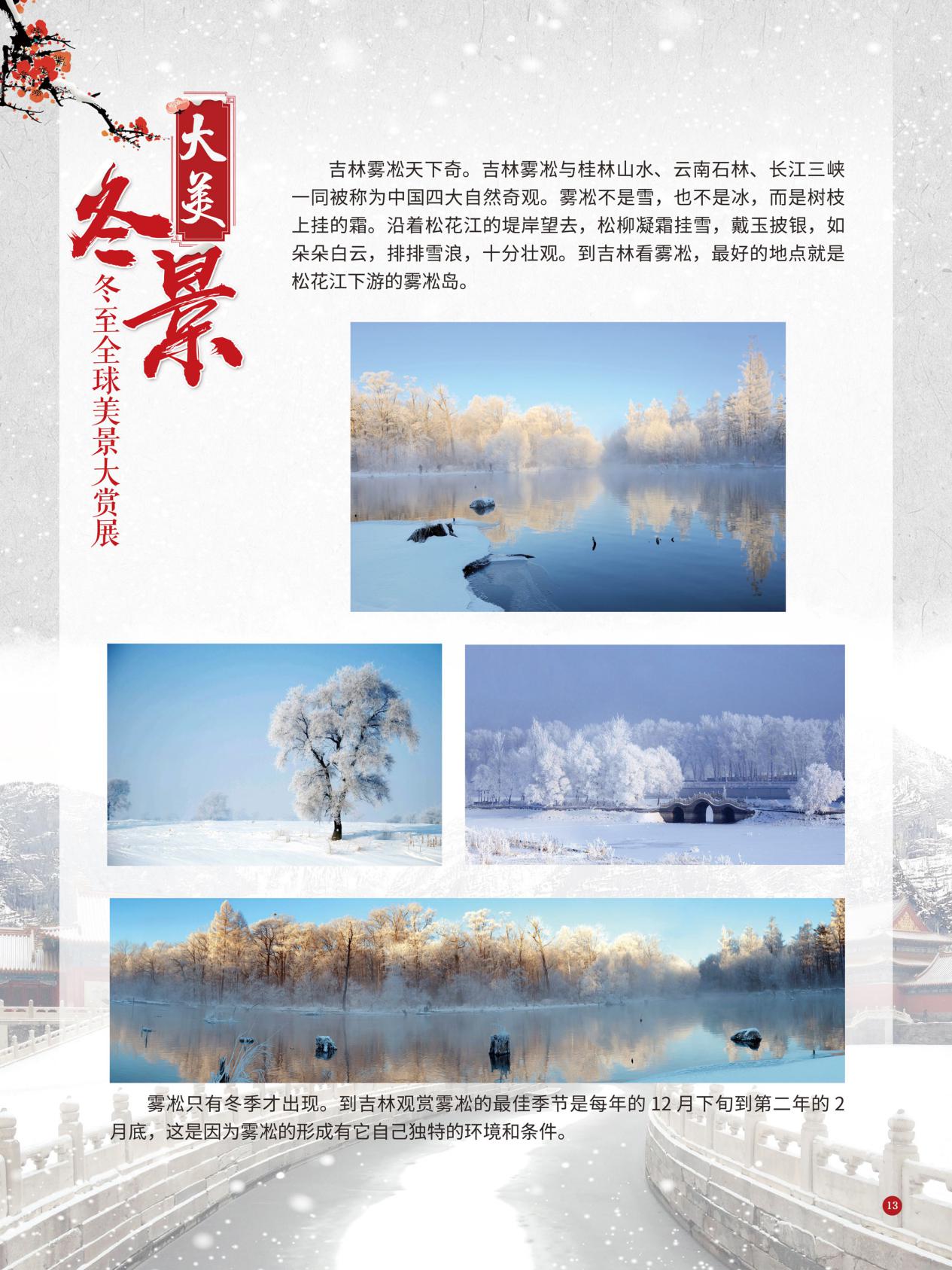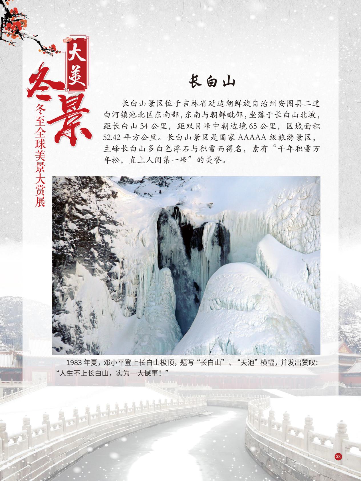 冬至是中国民间的传统节日,于每年公历12月21日至23日交节。冬至是四时八节之一,被视为冬季的大节日,在古代民间有“冬至大如年”的讲法,所以古人称冬至为“亚岁”或“小年”。冬至兼具自然与人文两大内涵,是二十四节气中一个重要的节气。 冰雪,是冬天谱写的一曲曲华丽乐章,是毛主席笔下的“北国风光,千里冰封,万里雪飘” ,是杜甫笔下的“窗含西岭千秋雪,门泊东吴万里船”, 是岑参笔下的“忽如一夜春风来,千树万树梨花开”,是柳宗元笔下的“孤舟蓑笠翁,独钓寒江雪”……地域不一样,冬天谱写的冰雪乐章也不一样,即便是同一处冰雪胜景,不同的人品出的也是不一样的味。冬天的美景是大自然的馈赠,本展览主要介绍冬至来临之后全球的冰雪美景奇观,带大家一起领略冬季的风采,探寻大自然的奥秘!