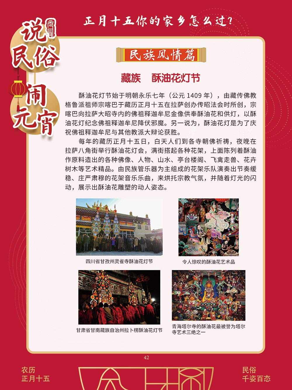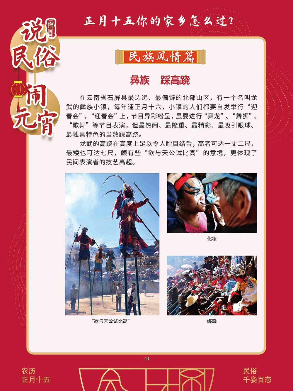 每年的正月十五这一天,赏花灯、猜灯谜、吃元宵、放烟花、耍龙灯、舞狮子、踩高跷、划旱船……这些衍生于汉民族传统习俗的节日活动接连上演,随处可见一派欢天喜地、热闹非凡。然而在幅员辽阔、地广物博的中华大地上,不同的民族和地域也形成了许多独具特色的元宵节习俗,其中很多都已被列为国家级非物质文化遗产。 这些从农耕文明孕育而来的岁时节俗,千百年来,孕育和滋养了博大而丰富的中国传统文化。它们经历了千百年漫长而复杂的发展变迁、代代相传,凝聚了中国劳动人民的智慧结晶,闪烁着中华民族的文明之光。 在西方节日流行的当下,我们对这些中华民族的灿烂民俗文化瑰宝又了解多少呢?是时候让灿烂的民俗真正“闹”起来,让传统节日融入当下的大众生活,在保留原有文化底蕴的基础上,从内容和形式上注入更符合现代潮流的创新元素,唤回年轻人们的关注。 正月十五你的家乡怎么过?不妨借此元宵佳节之际,让我们一起来说民族闹元宵,比一比究竟哪里的年味最浓!